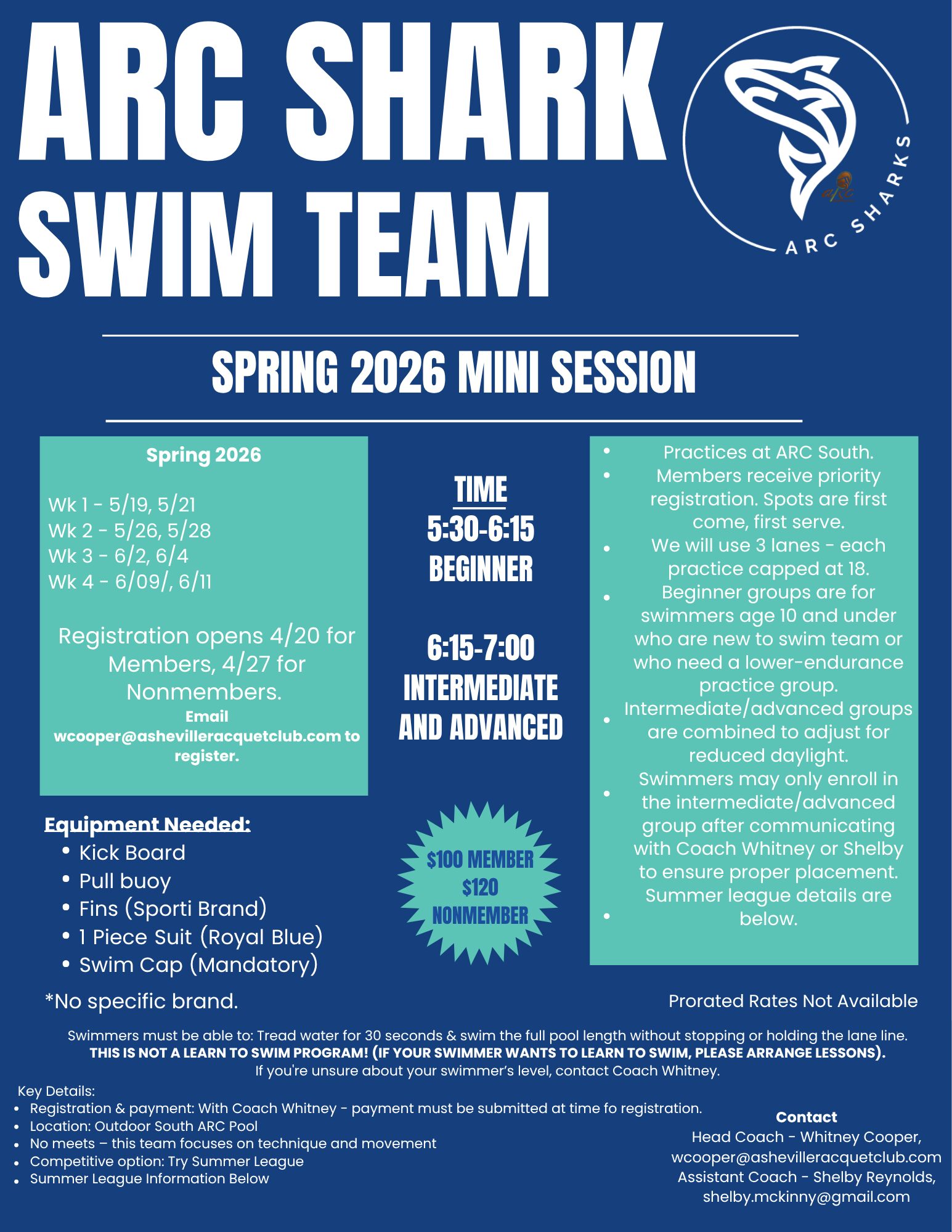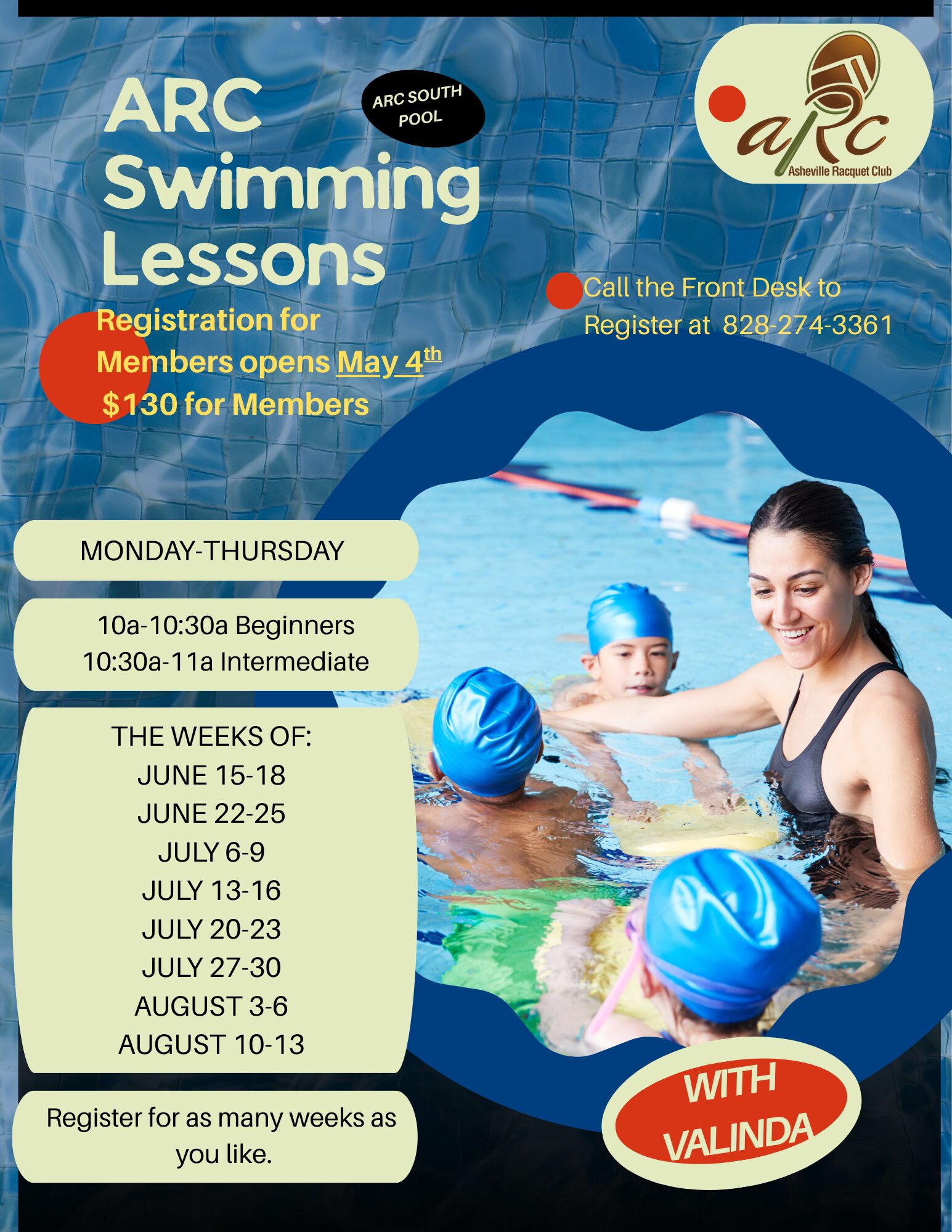 For any Information on Swim Lessons please email arcdowntownswim@ashevilleracquetclub or arcsouthswim@ashevilleracquetclub.com depending on your desired location.