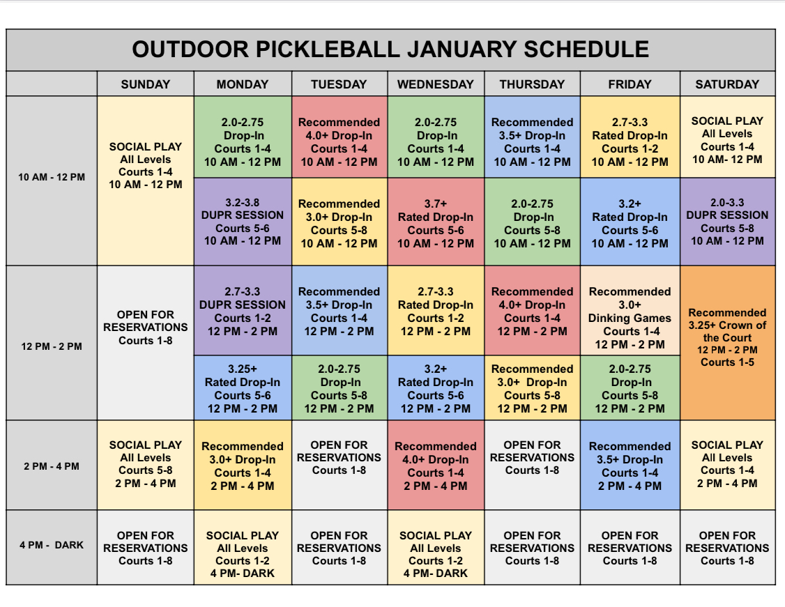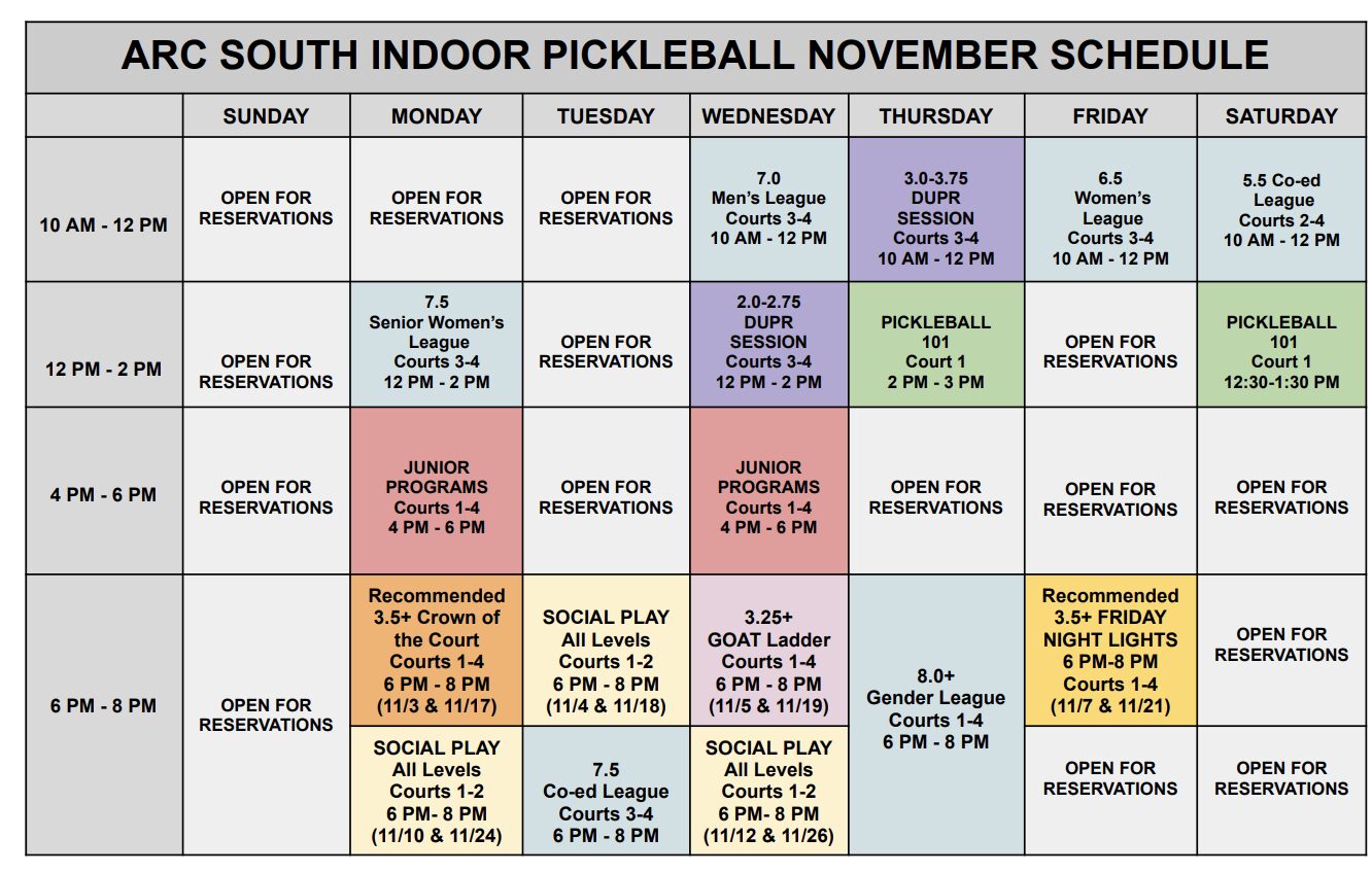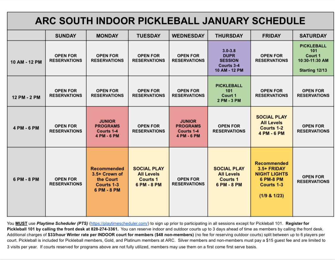 ***You MUST use Playtime Scheduler (https://playtimescheduler.com/) to sign up prior to participating in all sessions except Pickleball 101 (register for these with the front desk 828-274-3361). You can reserve indoor and outdoor courts up to 3 days ahead of time as members by calling the front desk. Additional charges of $20/hour apply to indoor courts split between up to 6 players per court. Outdoor sessions do not automatically move indoors in the event of rain or inclement weather but watch your email as we will notify if sessions move indoors and the cost. Pickleball is included for Pickleball members, Gold, and Platinum members at ARC. Silver members and non-members must pay a $15 guest fee and are limited to 3 visits per year. If courts reserved for programs above are not fully utilized, members may use them on a first come first serve basis.