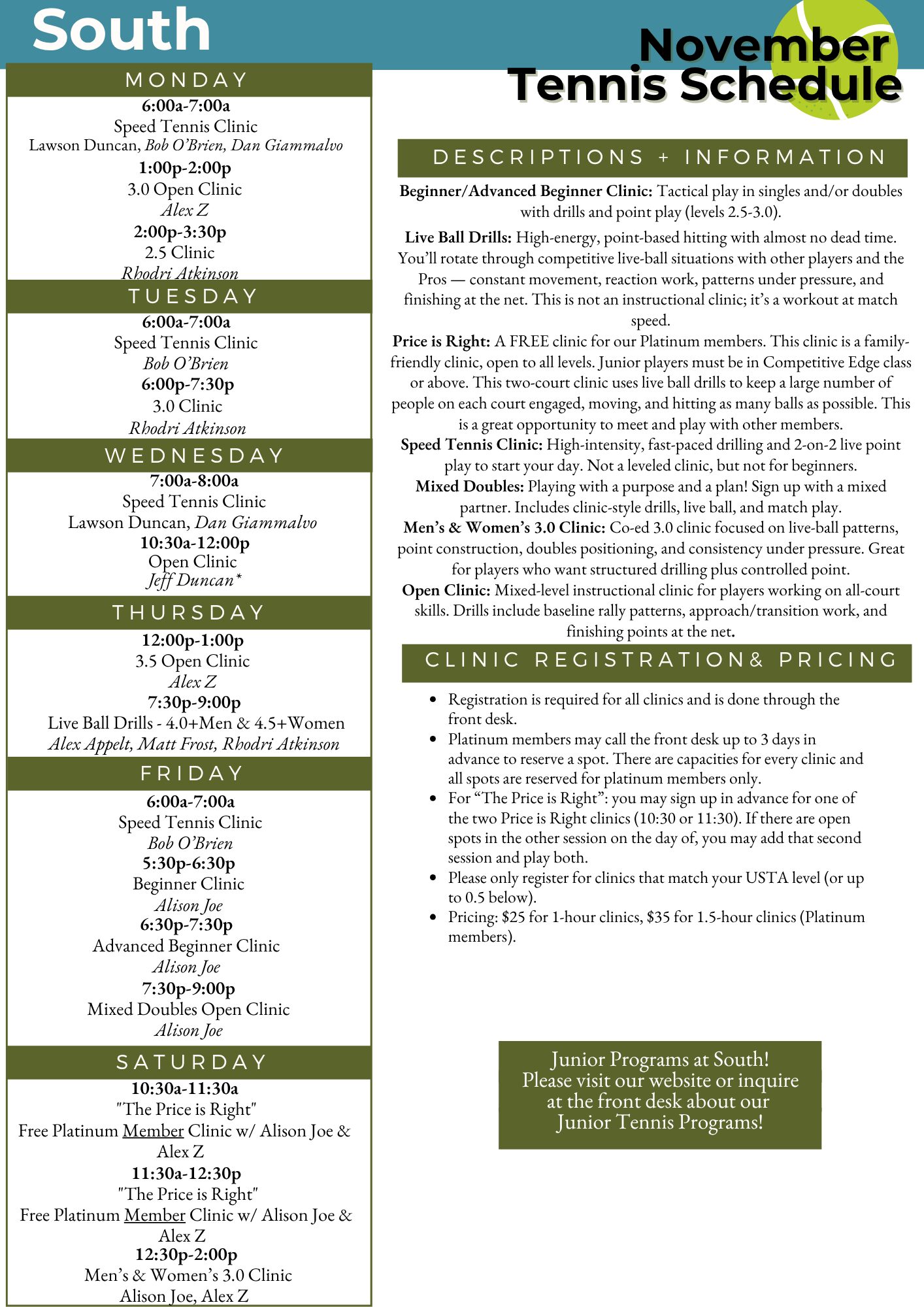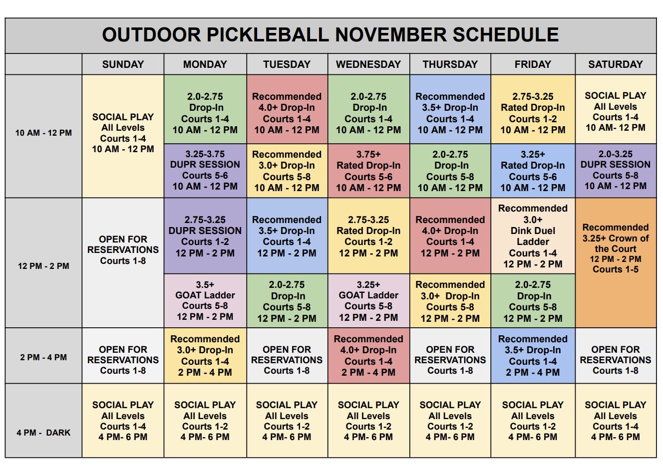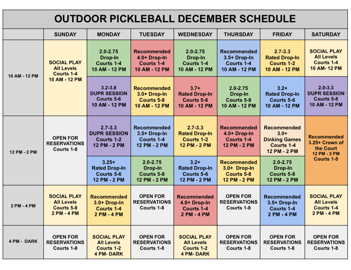 ***You MUST use Playtime Scheduler (https://playtimescheduler.com/) to sign up prior to participating in all sessions except Pickleball 101 (register for these with the front desk 828-274-3361). You can reserve indoor and outdoor courts up to 3 days ahead of time as members by calling the front desk. Additional charges of $20/hour apply to indoor courts split between up to 6 players per court. Outdoor sessions do not automatically move indoors in the event of rain or inclement weather but watch your email as we will notify if sessions move indoors and the cost. Pickleball is included for Pickleball members, Gold, and Platinum members at ARC. Silver members and non-members must pay a $15 guest fee and are limited to 3 visits per year. If courts reserved for programs above are not fully utilized, members may use them on a first come first serve basis.